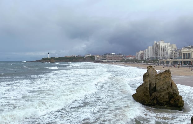 Biarritz, im 17. Jahrhundert Walfängerdorf, heute modänes Seebad mit mehr als 150jähriger Geschichte – Kaiser Napoleon III. und seine Gattin Eugénie sollen hier schon um 1850 die bleichen Füsse in die Sonne gehalten haben – ist nach wie vor bei Schönen und Reichen beliebt (und denen, die sich dafür halten). Als Velöler sind wir also hier genau richtig. Jetzt, im Spätsommer, ist immer noch viel los und die teuren Hotels sind gut besetzt. Die Oldtimer-Show heute Samstag fällt buchstäblich ins Wasser, es schüttet für einige Minuten wie aus Kübeln. Ein Drama für so manchen Cabriobesitzer.