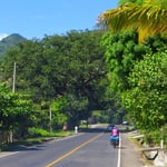 Nach neun Kilometern ist die Passhöhe auf der Ruta de Las Flores erreicht; wir sind das erste Mal in Schweiss gebadet heute. Die zwanzig Kilometer rassige Talfahrt bis Sonsonate bleibt heute das einzige Velovergnügen. Die vierspurige Strasse nach San Salvador ist extrem stark befahren, Lastwagen stinkt an Lastwagen, Diesel-Russfilter sparen sich die Salvadorianer ohnehin, zu allem Übel wird der Gegenverkehr wegen Baustellen über Kilometer auf unsere Strassenseite umgeleitet. Der Seitenstreifen verschwindet unter Müll und Sand. Blanker Radfahrer-Horror!