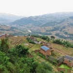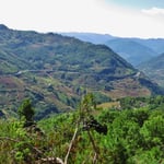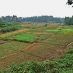 Die Landschaft wird bergiger, die Vegetation üppiger, die Luft feuchter und die Strasse lässt uns mal schnaufen und schwitzen und Kilometer später lange zu Tal sausen. Rauf und runter, Langeweile kommt nicht auf. Wie Treppenstufen kleben kleine und kleinste Felder an den steilen Berghängen. Gemüse, Mais, Chili, Zuckerrohr und Reis bilden mit der roten Erde einen wunderschönen farbigen Flickenteppich der fast ausschliesslich von Hand bearbeitet wird. Ab und zu ziehen Ochsen einen einfachen Pflug, vor allem aber sehen wir viele Hände, die säen, Reis und Zuckerrohr schneiden, Kartoffeln graben, Geerntetes auf dem Rücken mühevoll ins Tal tragen. Harte Arbeit seit Generationen, die beeindruckt.