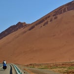Nach Turpan wird die Landschaft, oder korrekter die Wüste, wirklich zur Wüste. Die neue Schnellstrasse, eine vierspurige Autobahn mit getrennten Richtungsstrassen, führt uns in schier endlos langen Geraden und weiten Kurven stetig gegen Osten. Nach der Taklamakan fahren wir nun am Rande der Steppenwüste Gobi. Alle 70 bis 100 km eine Tankstelle, bis zur nächsten Stadt sind es rasch mal 150 km. Pit hat zusätzlich den Wassersack gefüllt, Bea Vorräte für drei Tage gebunkert. Wir mühen uns Kilometer um Kilometer ab, haben das Gefühl, nicht schnell genug vorwärts zu kommen. Langweiliges, monotones Velofahren ohne Abwechslung; vertrödeln wir hier unsere Zeit, die uns dann später im südlichen China fehlt? Wenigsten sind die Temperaturen jetzt im September mit höchsten 35 Grad tagsüber angenehm, der leichte Gegenwind als Kühlung willkommen.
