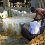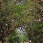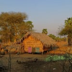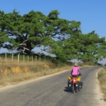 Landschaftlich ist die weite Ebene, die sich vor uns auftut, der Hammer. Lichter Wald, immer wieder Reis- und Maniokfelder, kleine Flüsse, Grasland. Ziegen, Kühe und Wasserbüffel grasen neben der Strasse, behindern auch mal den mässigen Verkehr. Erst nach und nach geht uns auf, was das Radfahren so angenehm macht, warum wir uns wohl fühlen: viele Errungenschaften einer modernen Gesellschaft fehlen in den ersten Reisetagen in Myanmar. Strom- und Telefonleitungen z.B. gibt es nicht (Energie aus der Steckdose fliesst nur von 18.00 bis 22.00 Uhr und morgens von 06.00 bis 07.00 Uhr, erzeugt von Dieselaggregaten). Die sehr einfachen Häuser schützen Dächer aus Palmwedel, für die Wände werden grosse Baumblätter ineinander geflochten. Gemauerte Bauten sind auf dem Land selten, Industriebauten fehlen gänzlich. Einzig Bier- und Whiskyreklame ist häufig, dient auch mal als Windschutz. Die kleinen Siedlungen werden meist von mächtigen Baumkronen überspannt, was den Eindruck von Geborgenheit vermittelt. Radfahrer gehören zum Strassenbild ebenso wie immer überladene Jeepney’s und Tuck-Tuck’s. Ja, Hunde gibt es auch. Sie sind aber Zweiräder gewohnt und beachten uns kaum.