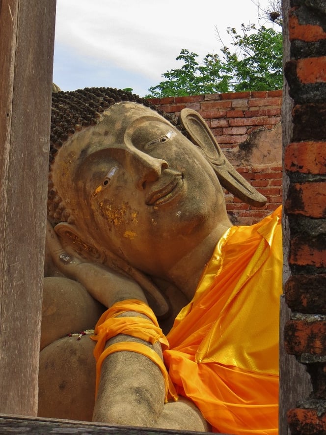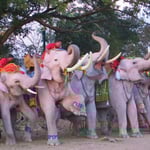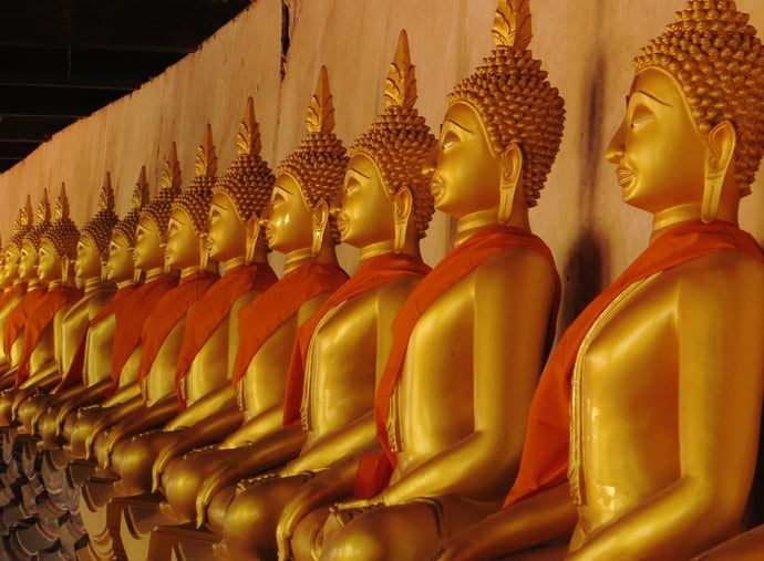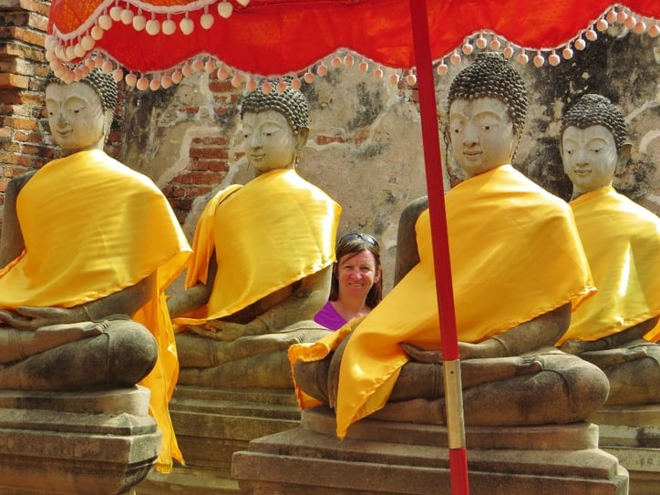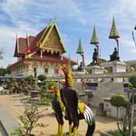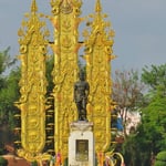 Riesig auch die Anzahl der buddhistischen Tempelanlagen (Wat) im Königreich; mehr als 30´000 sollen es sein. In jedem Dorf fahren wir an opulent verzierten, golden glänzenden Gebäuden inklusive Krematorium vorbei. Alle Altersschichten beten, meditieren, bringen Opfergaben dar; orange gekleidete Mönche spenden den Segen. Der König repräsentiert auf lebensgrossen Abbildungen mit ernster Miene die weltliche Macht.